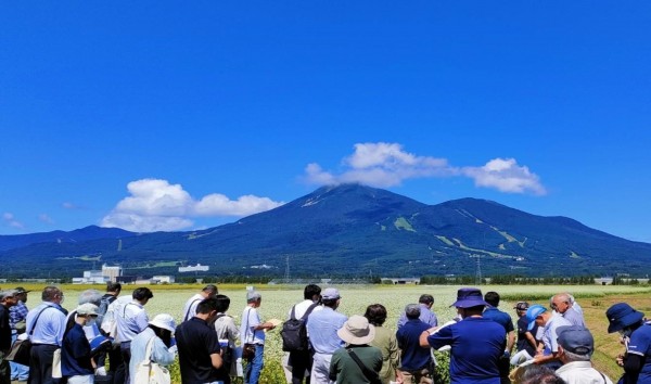 今回は福島県猪苗代町。磐梯山をバックに圃場視察、昼食でそばを食べた後、勉強会を行いました。
