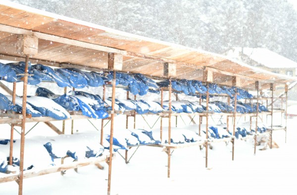 大寒に水漬けした「寒ざらしそば」は、水揚げ・脱水後、今は西蔵王の寒風に晒しています。
